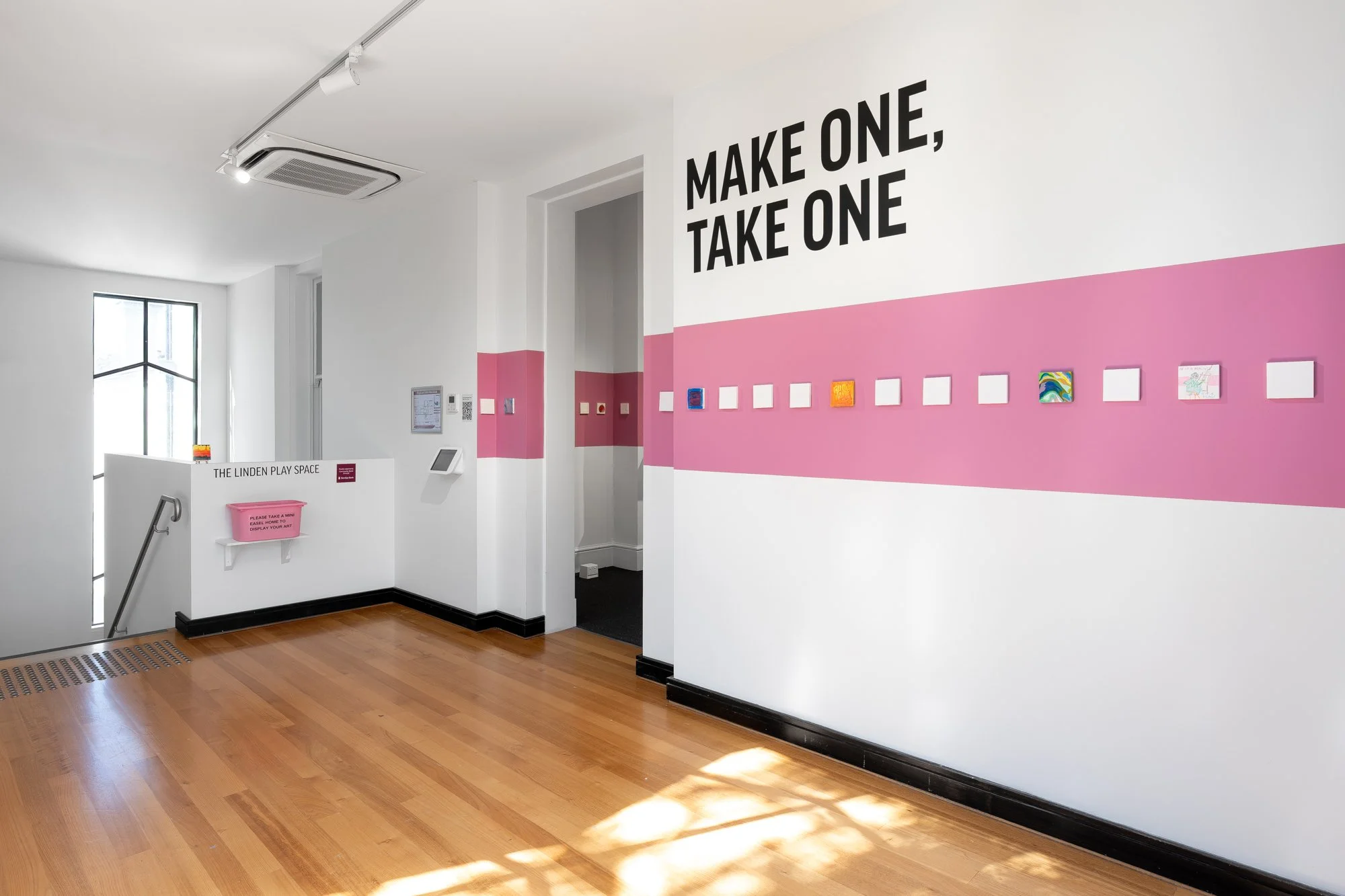 Make One, Take One invites gallery visitors to spend time in Linden’s Play Space creating a new artwork to display on the wall. In return, they can take home their favourite piece made by someone else.